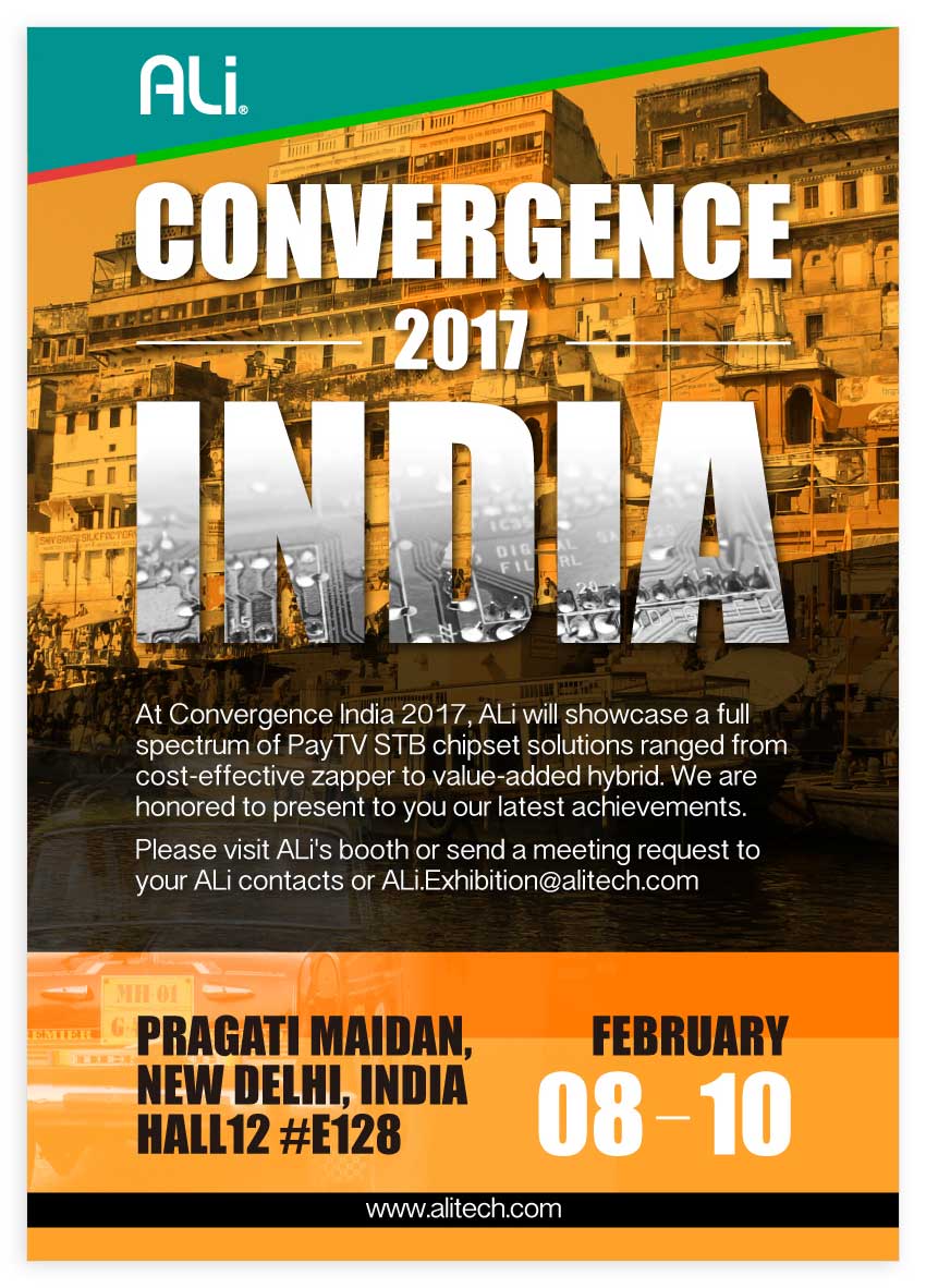 At Convergence India 2017, ALi will showcase a full spectrum of PayTV STB chipset solutions ranged from cost-effective zapper to value-added hybrid. We are honored to present to you our latest achievements. Please visit ALi's booth or send a meeting request to your ALi contacts or This email address is being protected from spambots. You need JavaScript enabled to view it..