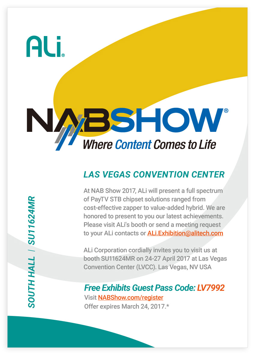 At NAB Show 2017, ALi will present a full spectrum of PayTV STB chipset solutions ranged from cost-effective zapper to value-added hybrid. We are honored to present to you our latest achievements. Please visit ALi's booth or send a meeting request to your ALi contacts or This email address is being protected from spambots. You need JavaScript enabled to view it..